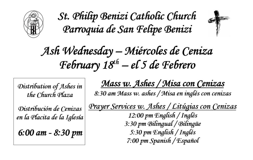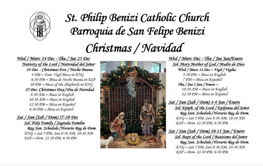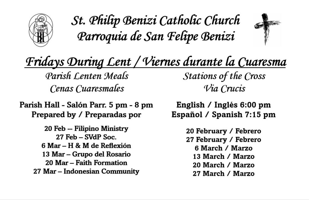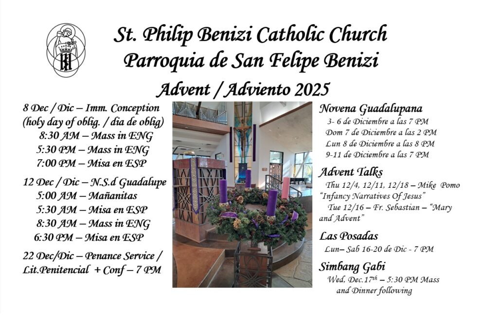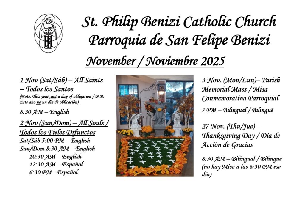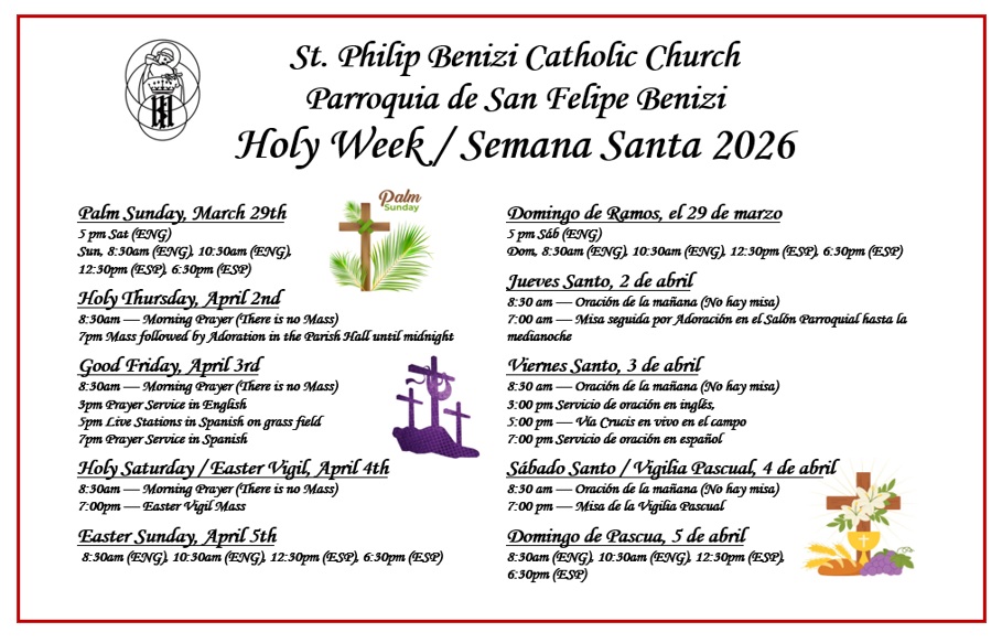 We, the Catholic Community of St. Philip Benizi, enriched by our cultural diversity, recognize, accept, and respond to the call to live the Gospel Message of Jesus Christ. We are nourished through Word and Sacrament, energized through participation in various ministries and social gatherings,and compassionately serve our brothers and sisters in need.